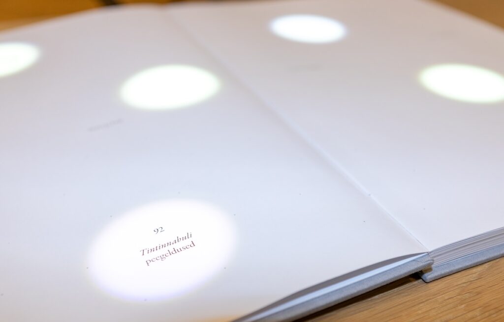 ”Kävijät löytävät keskuksen kirjastosta suurikokoisen kirjan, joka ei ole aivan tavallinen kirja. Se on painettu oikealle paperille ja reagoi ihmisen läsnäoloon, kosketukseen ja liikkeeseen. Vuorovaikuttaessaan kirjan kanssa kävijät avaavat uusia ulottuvuuksia, aivan kuin olisivat tekemisissä elävän olennon kanssa, jolla on oma persoonallisuutensa”, näyttelyn kuraattori ja tekstin kirjoittaja Maarja Tyler kertoo.