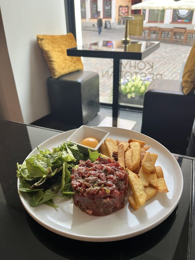 Among the starters, the rich terrine de campagne, or country-style liver pâté, is made entirely in-house. The small pickles and pearl onions complement the strong flavour nicely. The shrimp dish was well-seasoned with chilli and garlic. The classic raw steak tartare was very French—the meat was properly sliced and grated, not minced. The dish comes pre-mixed and had an excellent flavour. The generous portion is served with hand-cut French fries. C’est La Vie’s steak tartare is among the best in Estonia.