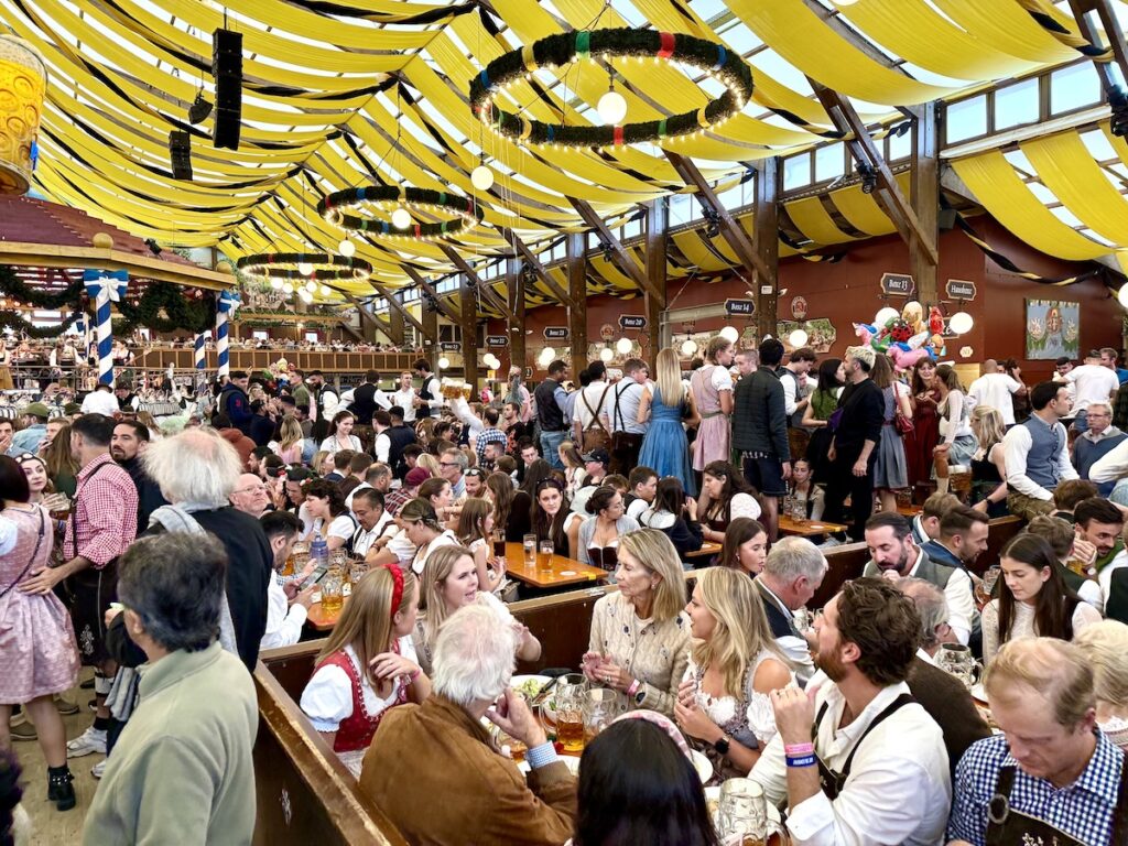 At Oktoberfest held at the Tallinn Song Festival Grounds, visitors enjoy traditional German beer, food, and music.