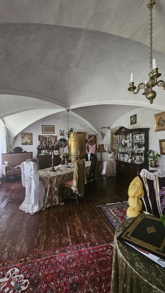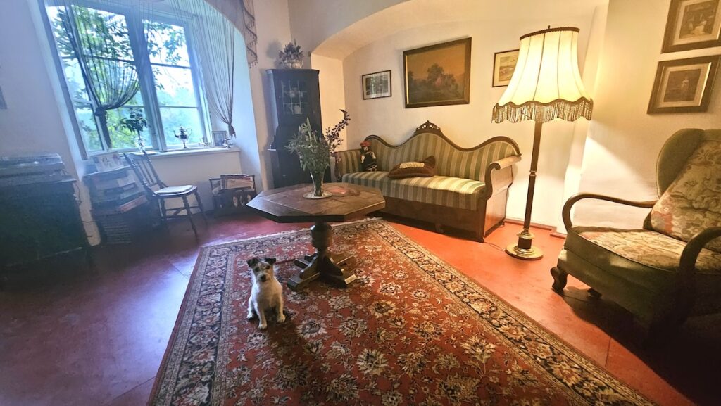 Solid oak stairs lead to the second floor, which houses a library, banquet hall, and salon. I admire the original fireplace from the late 1700s. I can picture Baron von Wolf enjoying a cigar with friends by the fire after dinner. The atmosphere of that era seeps into your bones.