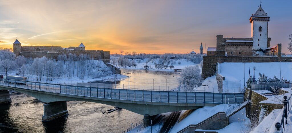 Näkymä Narvajoelle, Viron ja Venäjän rajalle, on vaikuttava. Jokimaisema on erityisen hieno talvella. Oikealla Narvan Hermannin linna.