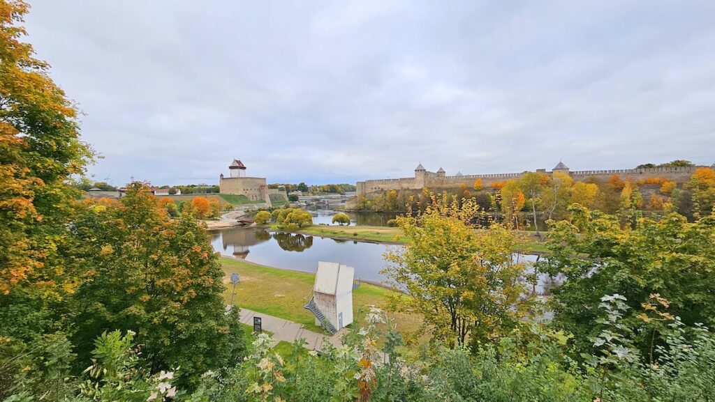 Lounastan tutuksi tulleessa Valge Kõrvitsassa. Ramen on kelpo ja koirani saavat rapsutuksia tarjoilijoilta ja kokilta. Ruokailun jälkeen otamme suunnaksi Narvanjoen. Saavuttuamme rantaan lähdemme kävelemään rantapromenadia Joaorgin rantatalolta kohti Pimeää puutarhaa (Pimeaed). Meillä ei ole koirien kanssa kiirettä mihinkään. Istahdamme Hermannin linnan tuntumaan katselemaan rajajoen hiljaista virtausta. Vastarannalla kohoaa jykevä Iivananlinna. Viikonloppuisin kävelykadulla on yleensä vilinää, mutta nyt tunnelma on raukea. Kalastajia näkyy molemmin puolin joentörmää.