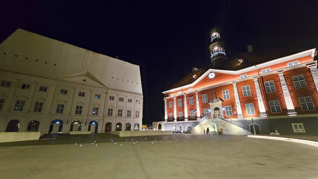Taloesittelyn jälkeen suuntaan raatihuoneelle, joka on yksi harvoista säilyneistä barokkiaikaisista rakennuksista Narvassa. Upean punaiseksi maalatun rakennuksen tiloissa toimii nykyisin matkailuinfo ja kaupunginvaltuusto. Raatihuoneella on myös avattu virtuaalinäyttely, joka vie kävijän aikaan ennen toista maailmansotaa ja näyttää, millainen Narva oli ennen 1944 maaliskuun pommituksia.