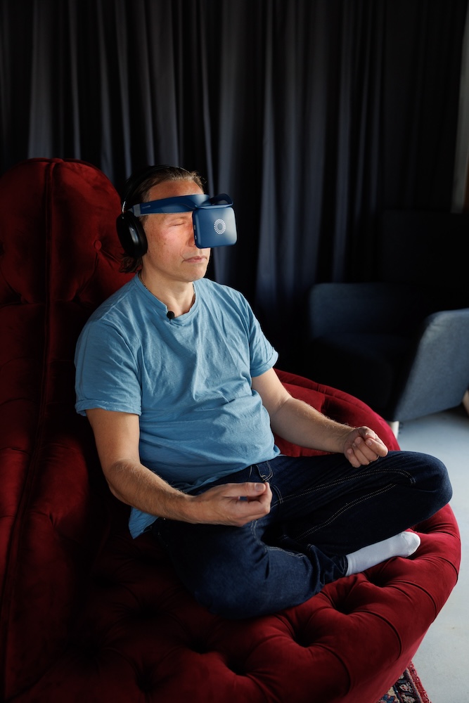 Haastattelun lomassa LuxSanatissa Kristjan kokeilee neurostimulaatiolaitetta, jonka väitetään parantavan keskittymiskykyä, stressinhallintaa ja fyysistä palautumista.