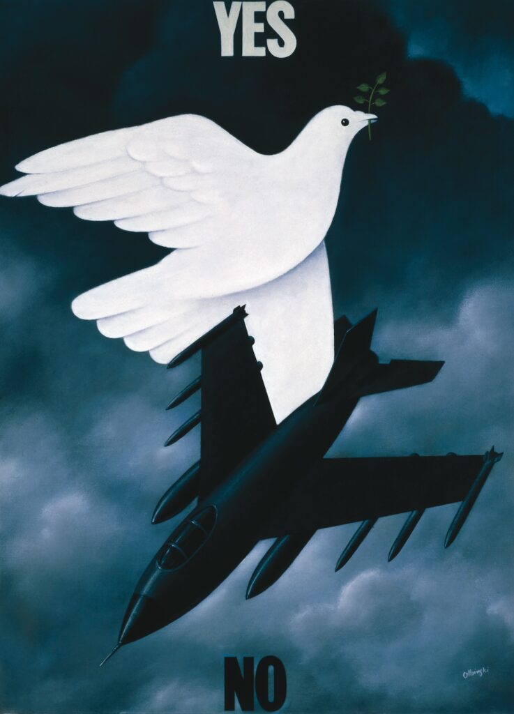 Rauhan ja rakkauden symboli kyyhky näkyy monissa töissä. Rafał Olbińskin maalaus YES-NO.