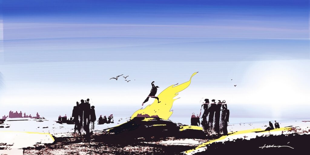 Juhannuskokon hiipuessa sen yli hypätään, pariskunnat käsi kädessä, sillä taika tuo onnea parisuhteeseen. Toiset pariskunnat poistuvat seurueesta sanoen menevänsä etsimään kukkivia saniaisia. Kasvitieteilijät tosin väittävät, ettei saniainen kuki, mutta juhannusyössä on salaperäistä taikaa.