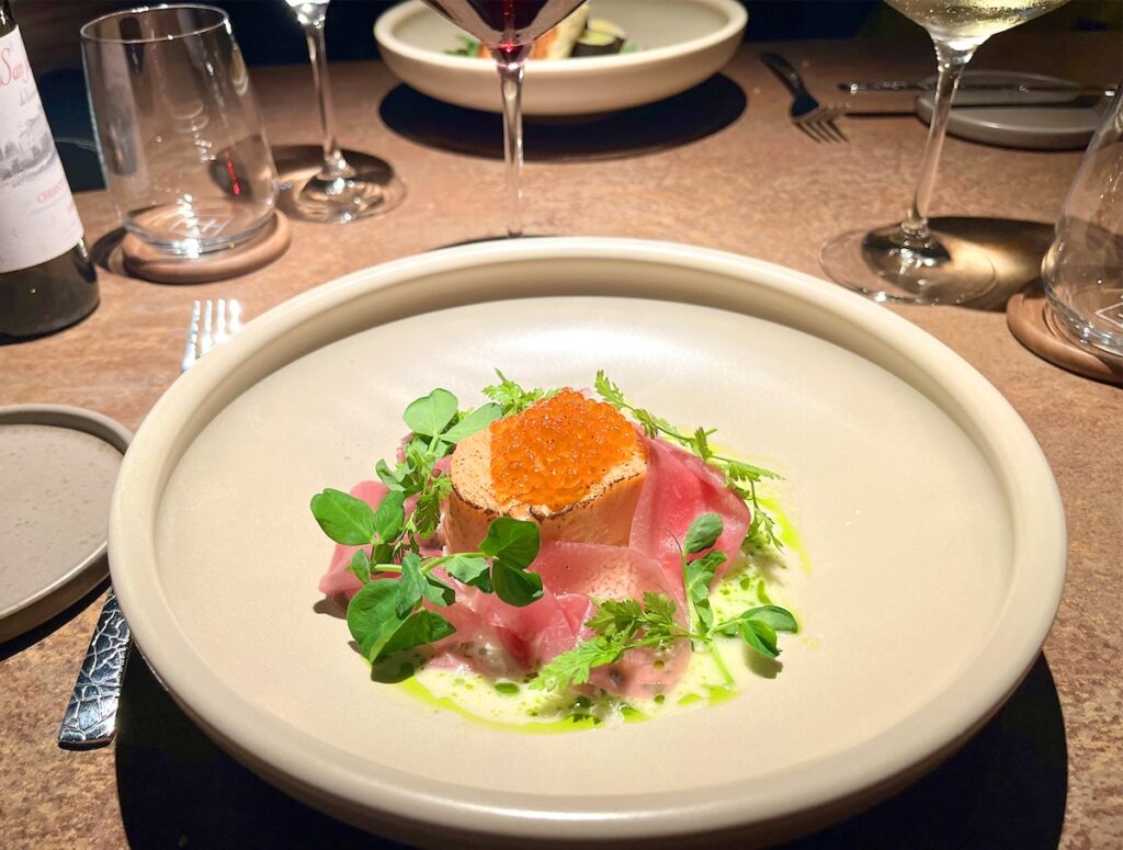 Taimen-annos oli saanut kruunun mädistä. Kaali sekä hieman savuinen heinävoikastike tekivät sisältä sopivasti raa’aksi jätetystä annoksesta suussa sulavan.
