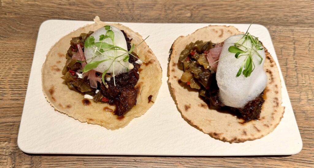 Virolainen versio meksikolaisista tacoista oli ehkä jopa liian suuri. Kaksi naudan ulkofileellä täytettyä tacolettua, jotka on höystetty salottisipulilla ja vuohenjuustolla oli maukas ja tuhti alkuruoka.