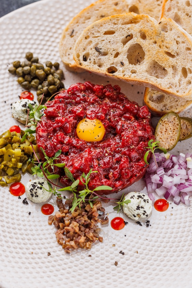 Klassisen Dunkerque Boeuf à la Tartar -annoksen voi itse sekoittaa lautasella olevien mausteiden kanssa. Annoksesta saa halutessa mukavan tulisen.